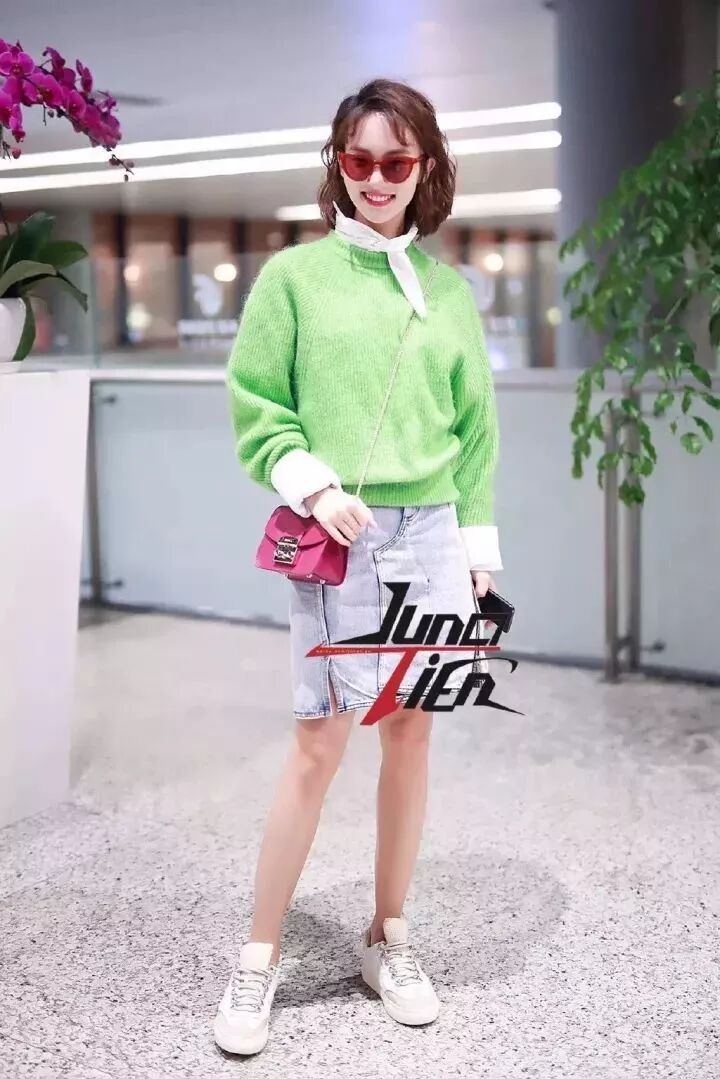 金晨也用这么搭配,不过走的是青春路线,浅绿色针织衫搭配白衬衫,清新到不行,小白鞋更显青春活力。