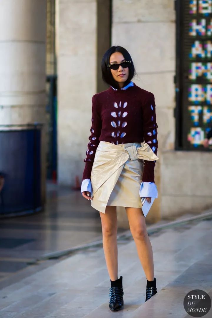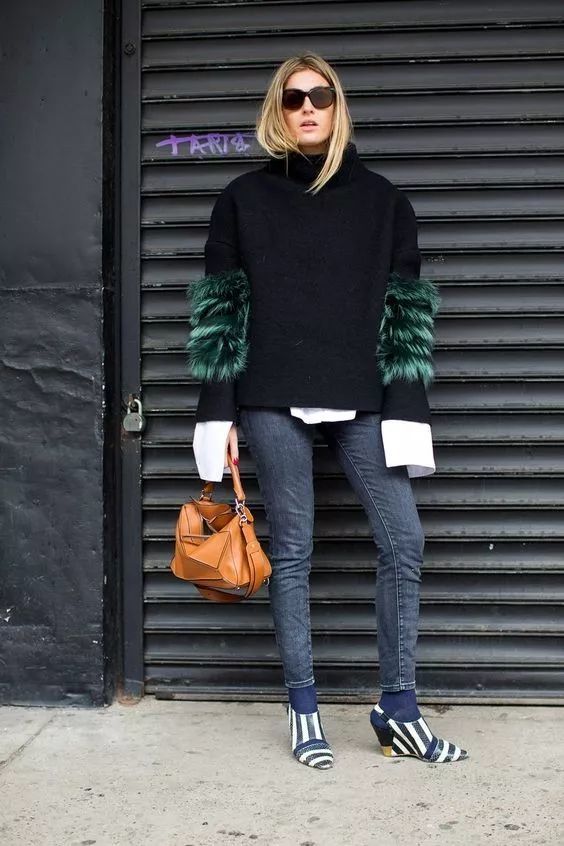 高领针织衫的穿搭点就在于露下摆,衣袖。小部分的露下摆显得随性。