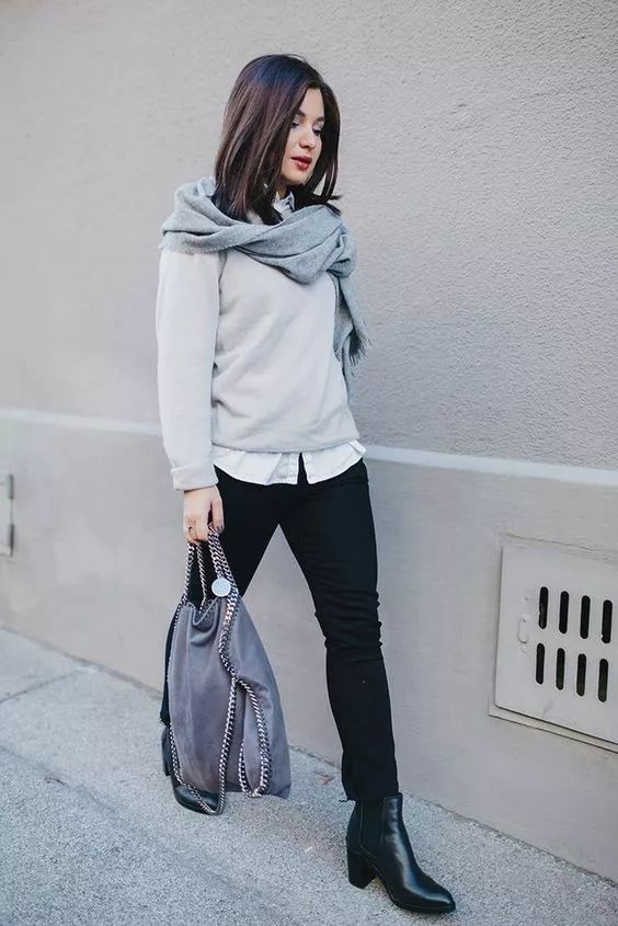 针织衫+白衬衫+和小黑裤的组合,最简单的三种颜色,都是纯色毫无花纹,休闲但不失简约。