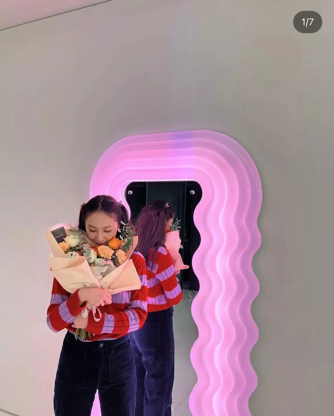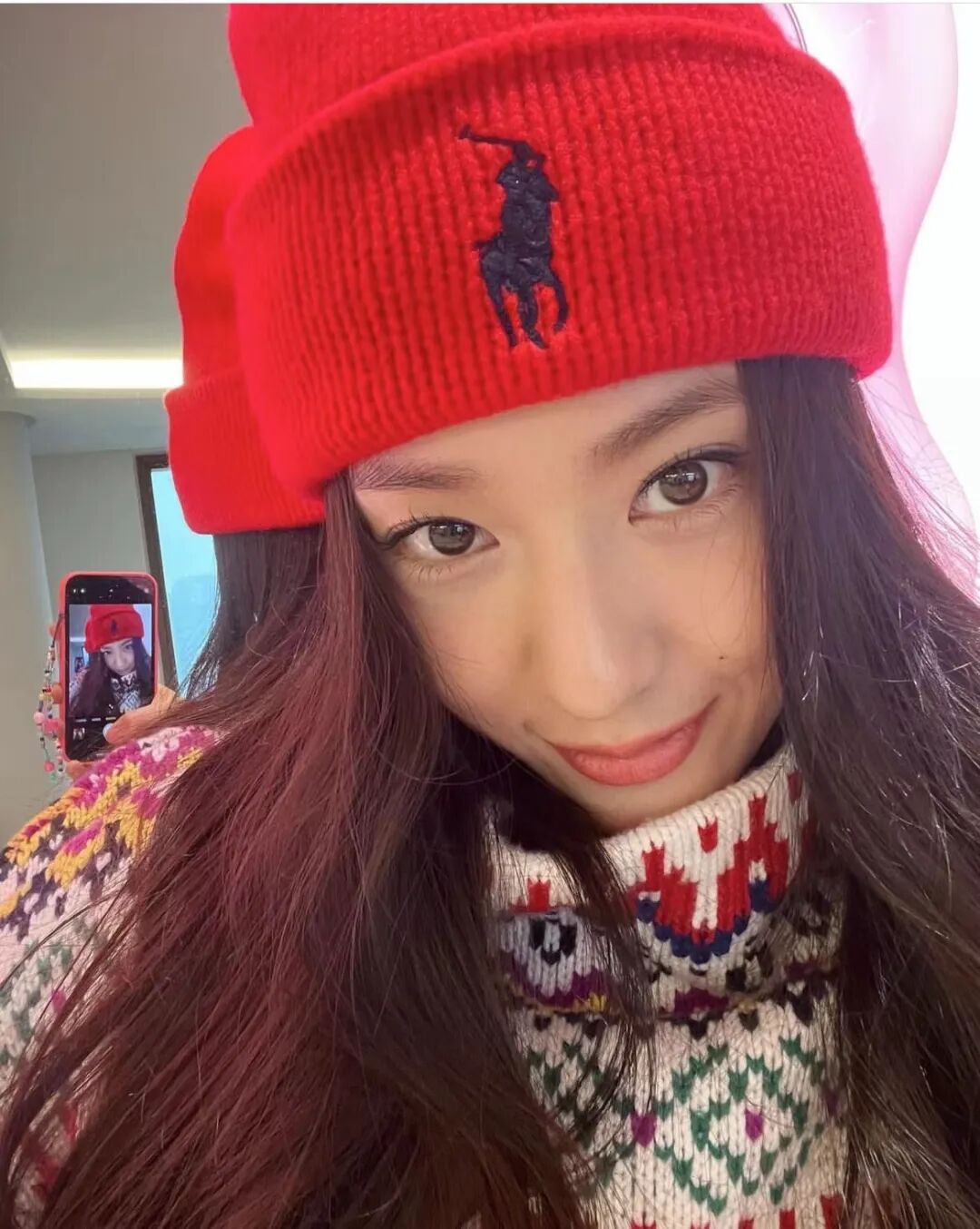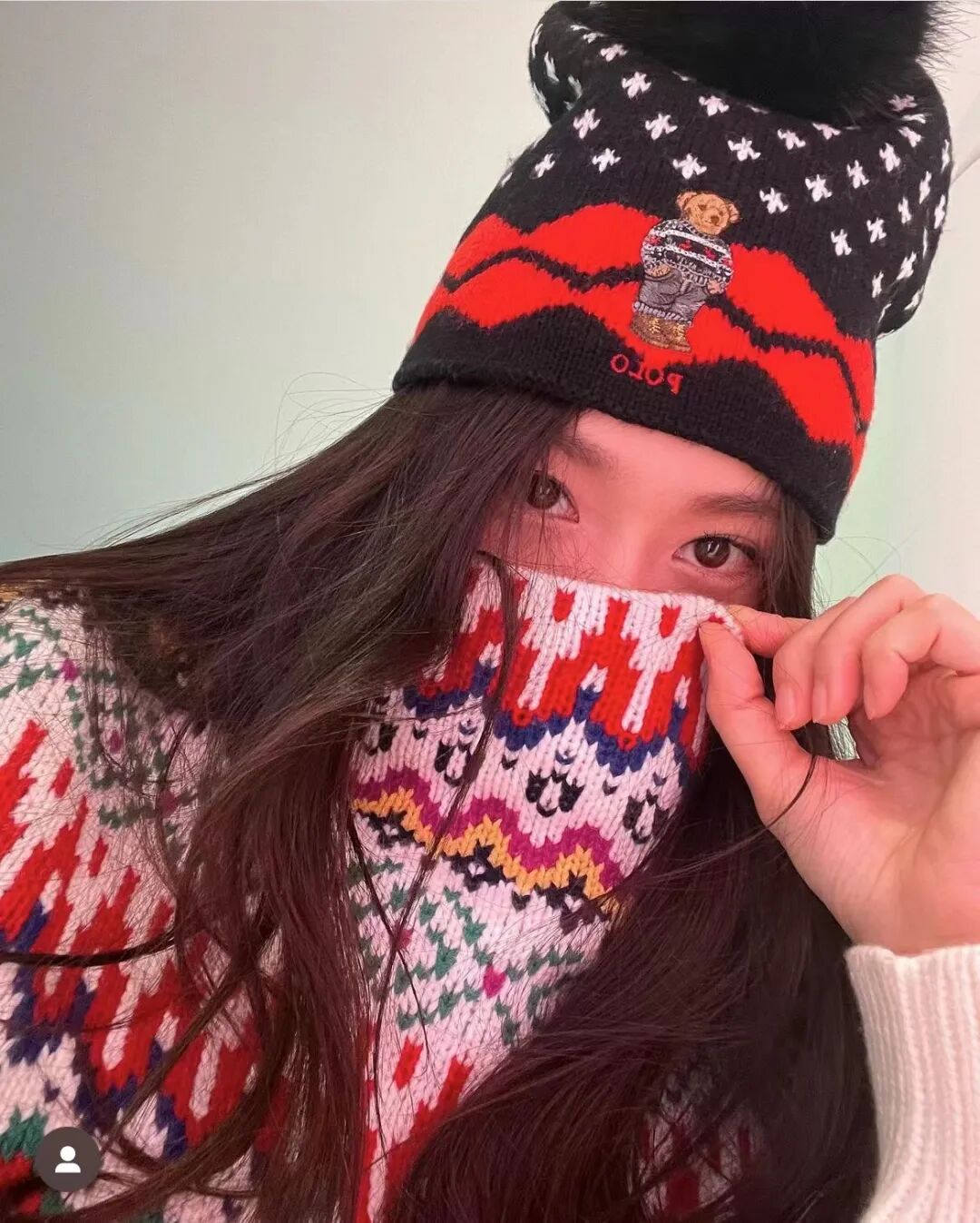 除了棒球帽,冬季也正是针织帽的主场。节日期间,郑秀晶也不遗余力分享了多款撞色冷帽,搭配彩色提花毛衣,透过屏幕,都能感受到溢满的节日氛围。