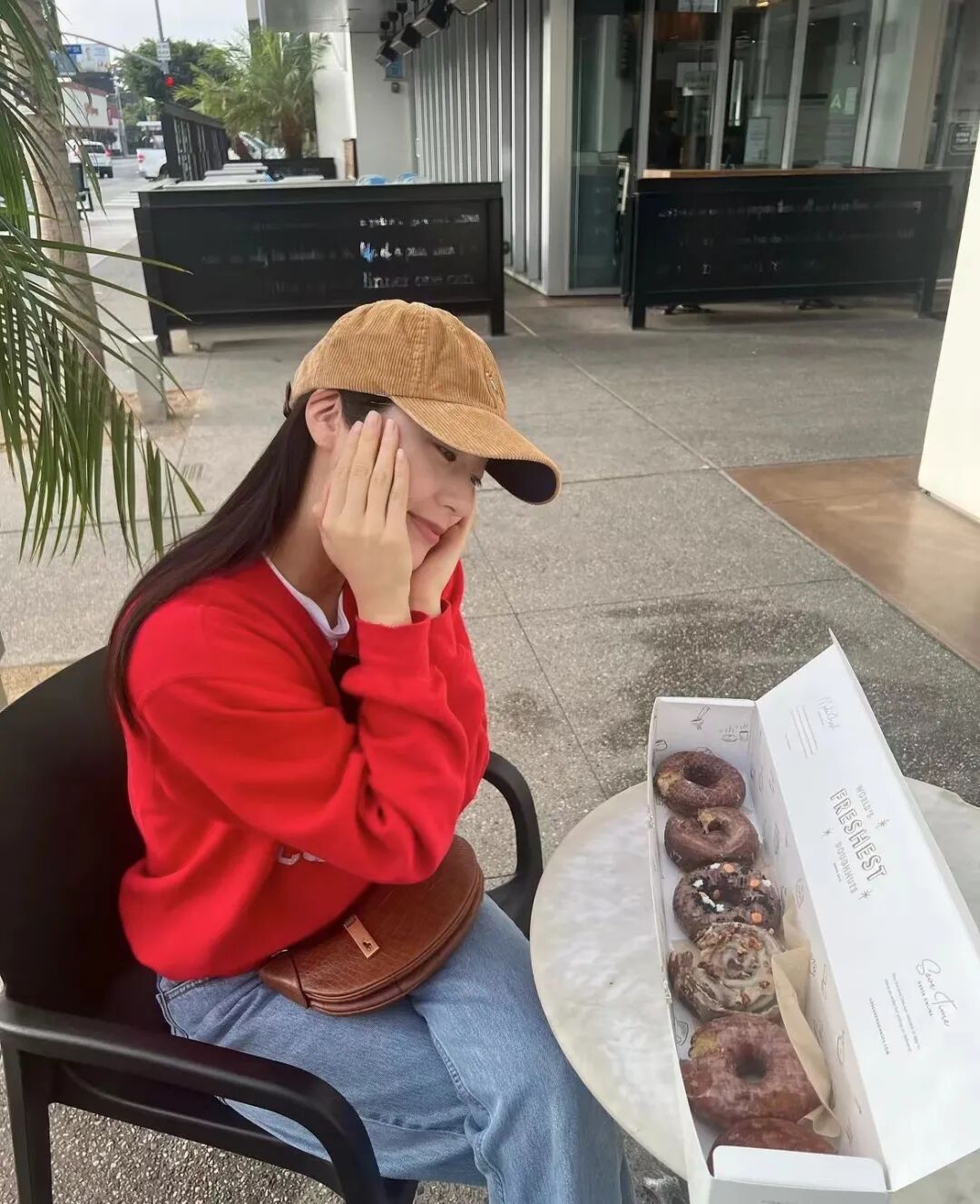 抢眼的红色卫衣,以棕色灯芯绒棒球帽和做旧水洗牛仔裤来中和浓郁感,轻松随意,又增添一抹复古味道。