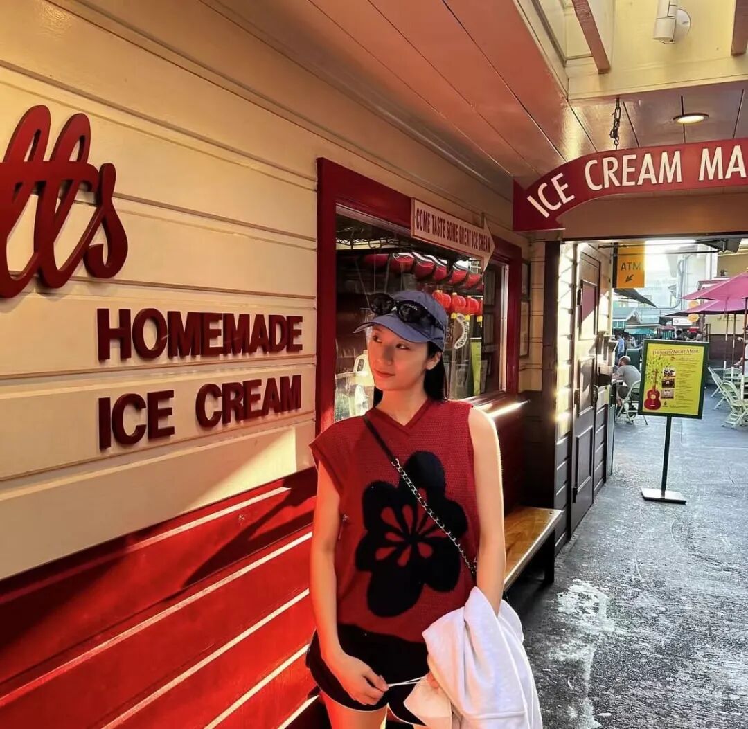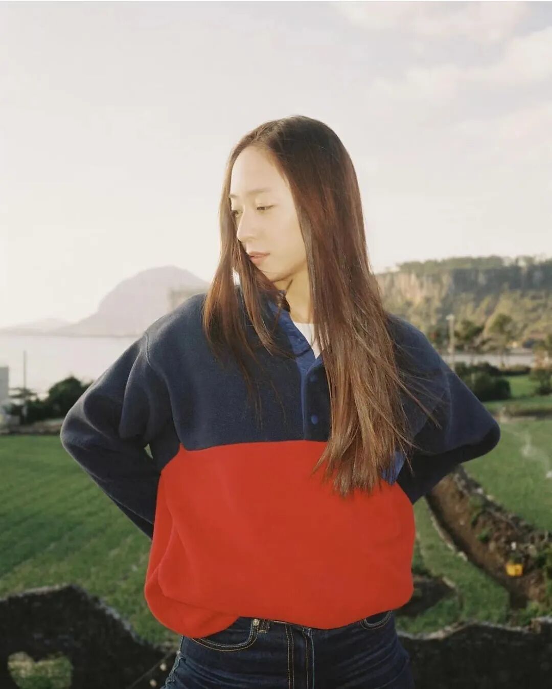 除了中性色调,抢眼的亮色也能被她消化地更具包容度。比如这件高领Polo衫,因为海军蓝色与红色的撞色搭配珊瑚绒的面料,胶片滤镜之下,美式校园风呼之欲出。