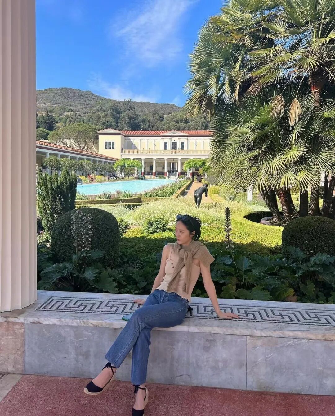 旅行中,也能将针织衫解锁不同穿法,随性的披在肩上,再搭配牛仔裤和编织高跟鞋,不经意间透着些许法式气息。