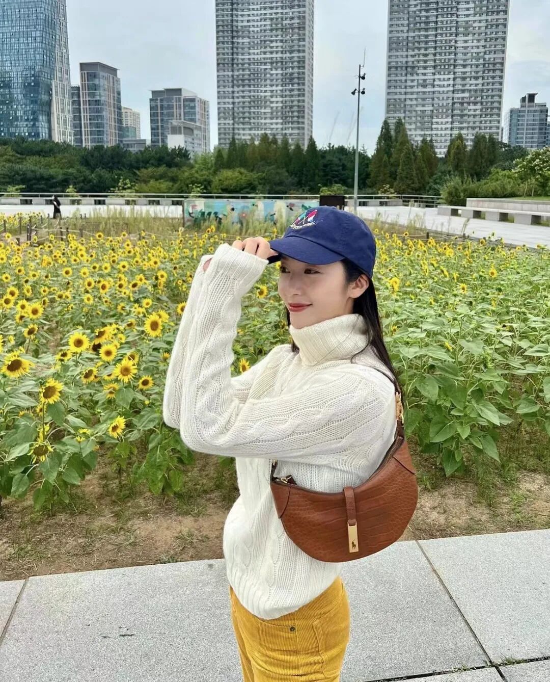 复古高领和经典圆领的针织衫,前者搭配灯芯绒长裤与棒球帽,后者搭配经典牛仔半裙,随性却各有态度。