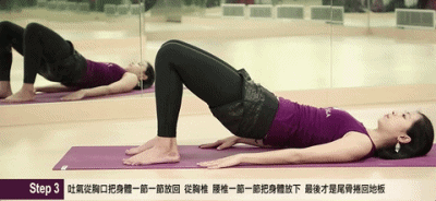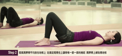 1.平躺在地板上,双脚和髋关节同宽,手掌放在臀部两旁,掌心贴地,肩膀到耳朵距离尽量拉长,手指尖尽量往脚尖方向走;