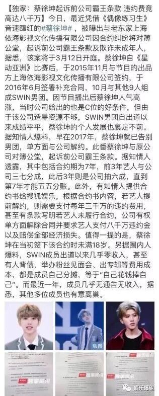 2018年的2月28日,媒体曝光了蔡徐坤起诉自己的老东家,称这家公司存在大量的霸王条例,就是因为这样才导致蔡徐坤退出SWIN。