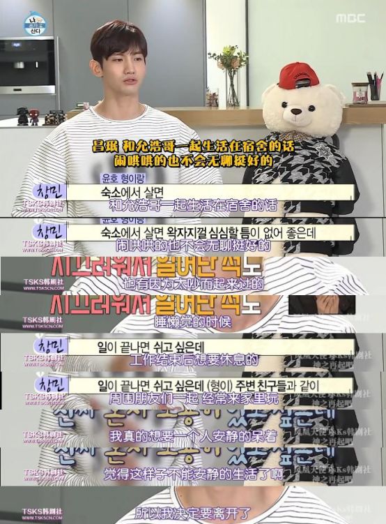 沈昌珉说了想要搬出来是因为想要安静,两个人的宿舍生活不安静的因素都来自这位郑允浩。