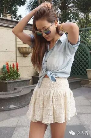实在对腰部没有自由,又想尝试短板上衣的妞儿,可以学孙芸芸这样将衬衫绑起来微微小露一下,也是不错的选择哦!