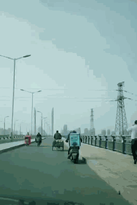 前面,一个大爷骑着三轮车很用力地在上坡,