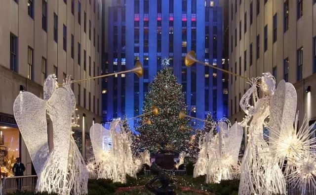 纽约洛克菲勒中心前的圣诞树。挂了4.5万盏彩灯,是纽约最大的圣诞树,重达10吨,每年从它搭建开始就是万众瞩目的焦点。