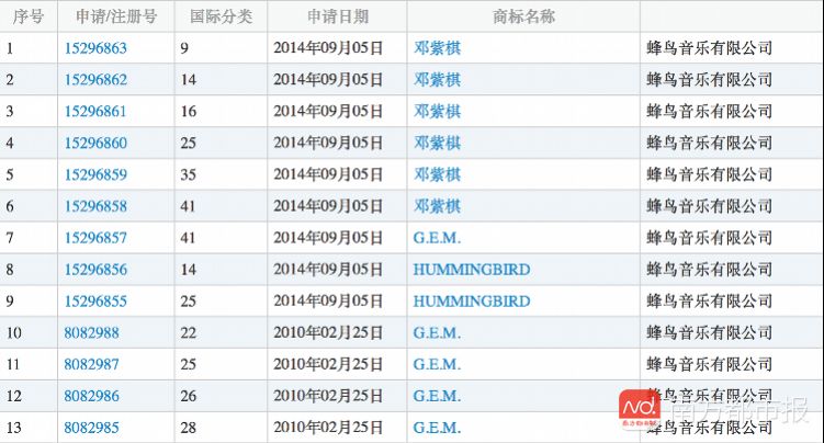 蜂鸟音乐以“邓紫棋”、“G.E.M.”注册了多枚商标。
