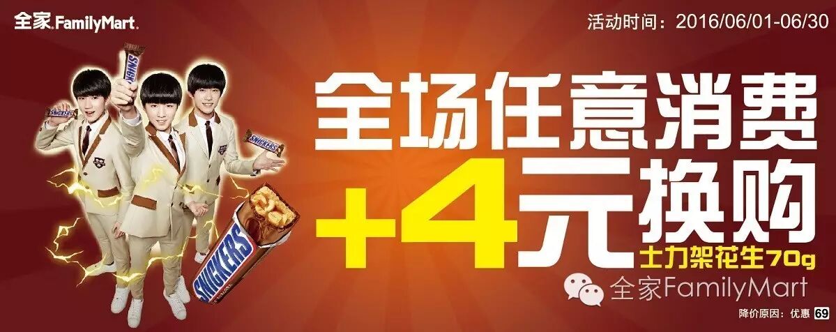 现在来全家购买2条51g士力架即可获得TFBOYS明信片一套!!