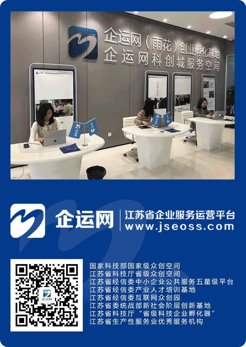 企运网—江苏省企业服务运营平台,国家级众创空间、省级中小企业公共服务示范五星级平台、省级互联网产业人才培训基地、省级互联网众创园、省委统战部新阶层创新基地,采用V2V+O2O,为政企提供政策咨询、经贸交流、金融服务、教育培训、平台运营等服务
