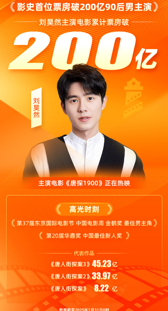 刘昊然主演电影《唐探1900》正在热映中,此部电影助刘昊然主演电影累计票房破200亿元,他成为中国影史首位票房突破200亿元的90后男主演。