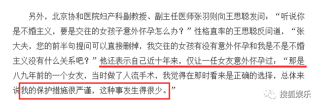 而且曾经在一个问答APP上,王思聪自曝过他只在20岁的时候让一个女生意外怀孕过,但是他的保护措施做得很严谨……这种事很少发生……