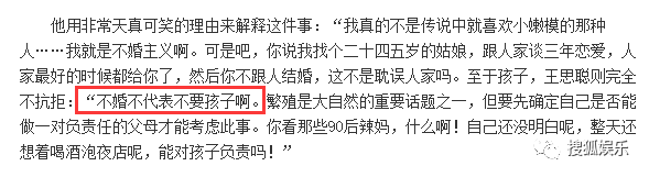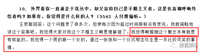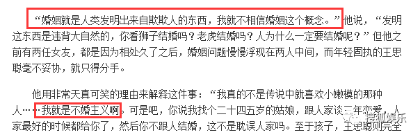 但是王思聪也解释过,他所说的“不婚”并不是说不结婚,而是觉得用一张证把俩人绑定在一起是特别没意义的!