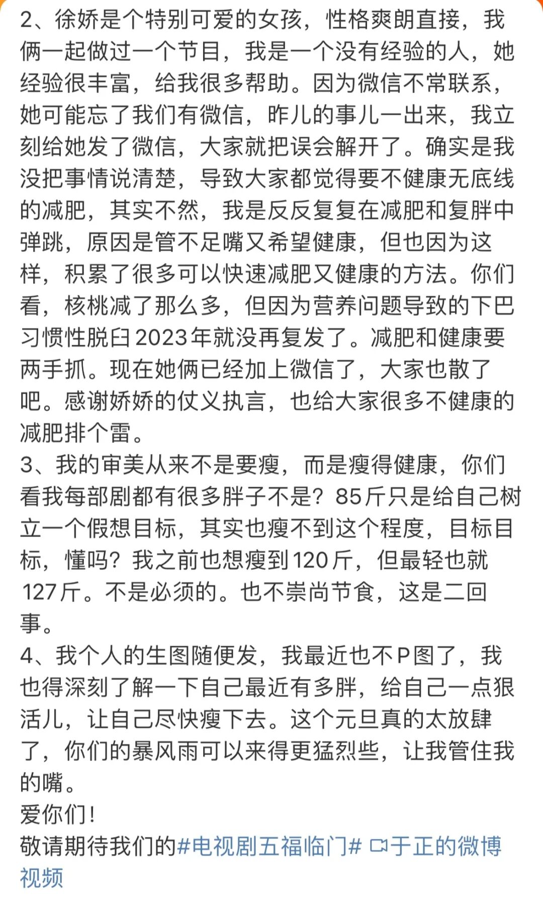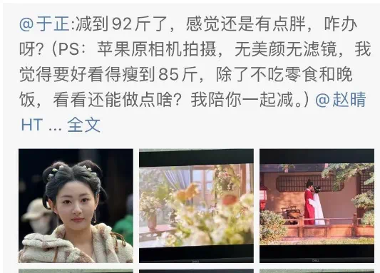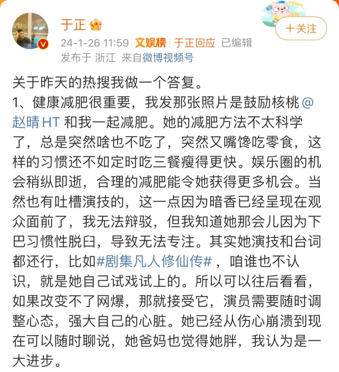 首先,于正发了一个微博,说旗下演员赵晴92斤太胖了。
