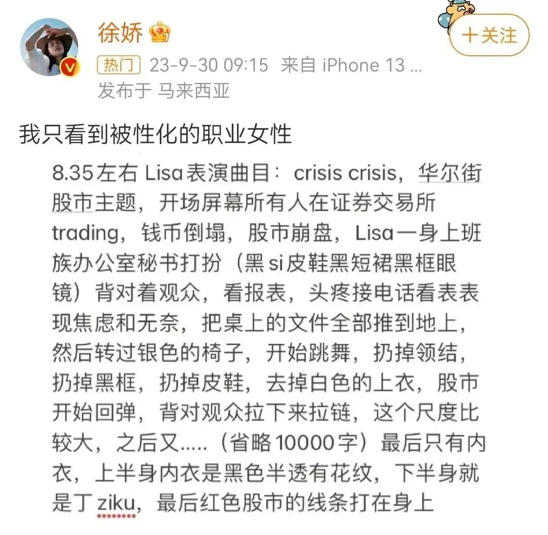 再比如疯马秀事件,徐娇发声表示疯马秀不太好,涉嫌物化女性,然后在评论里被骂开花。