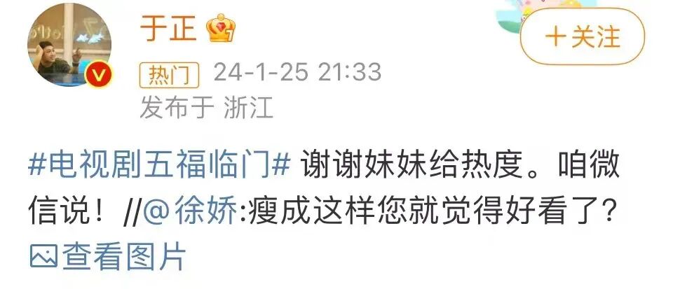 但也在于正的这个回复前后有一个热搜叫做#徐娇赵晴微信都没有#,有一部分网友留言说徐娇蹭热度,明明和赵晴都不认识还要装闺蜜。也有一部分网友说,徐娇仗义直言,和赵晴不是朋友一样为她出头。