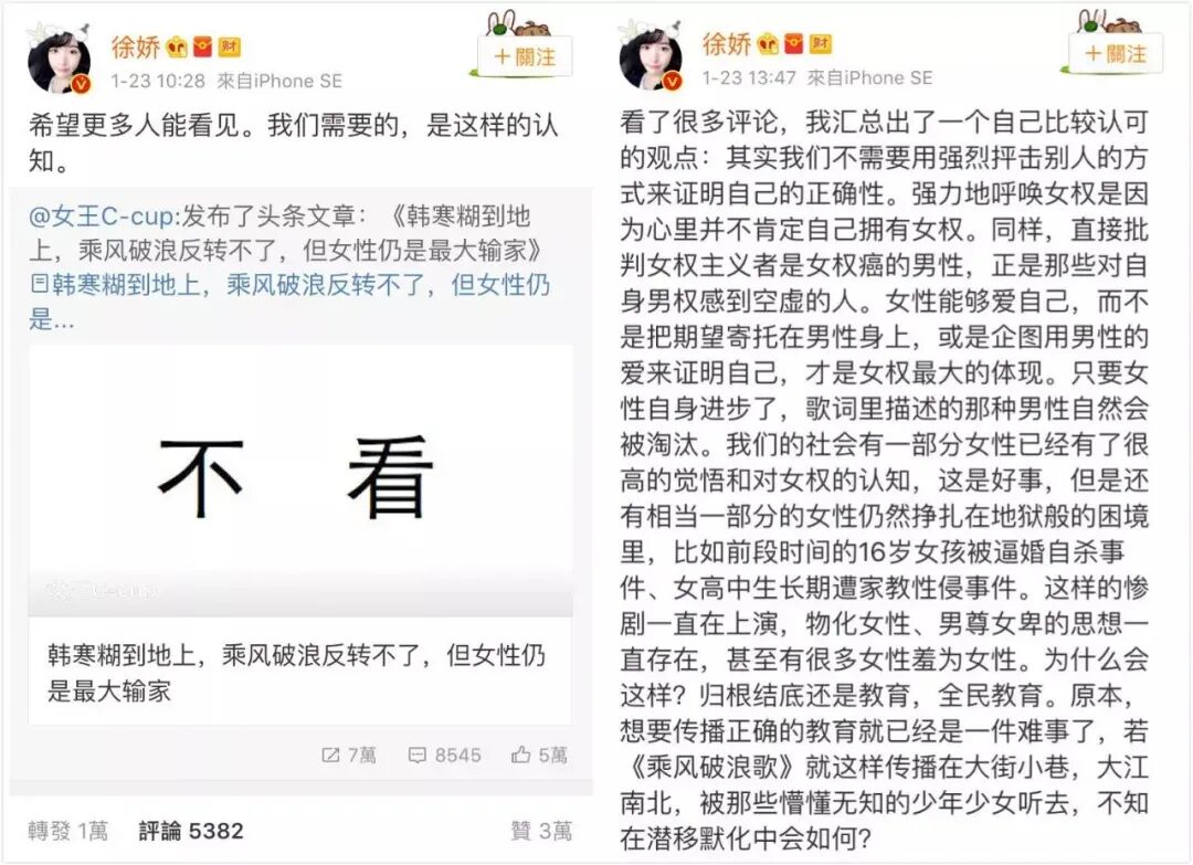 比如2017年,韩寒的电影《乘风破浪》中有一段直男癌歌词,当时大众讨论热度很高。徐娇是演艺圈里很少很少会站出来说这个歌词不对的明星。