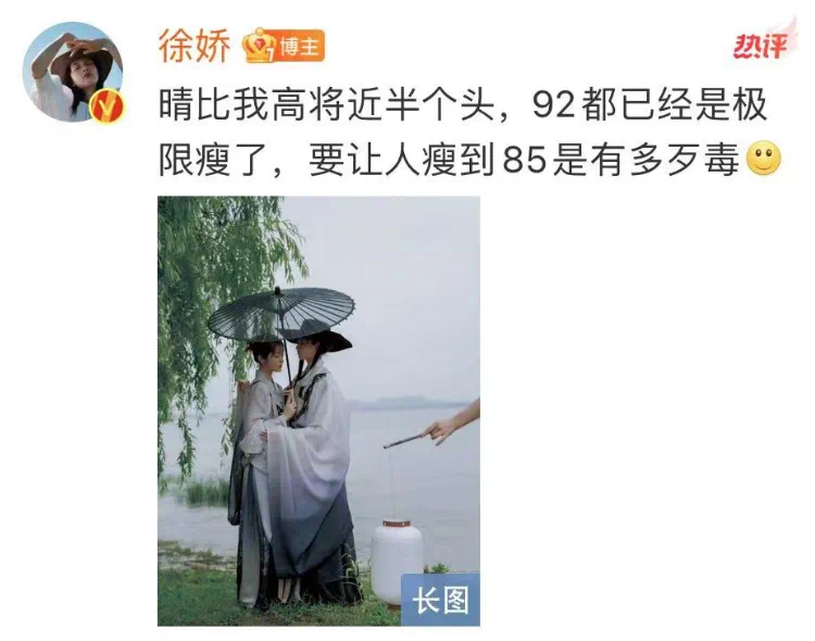 之后,徐娇还发了一个和赵晴的合照,她说赵晴个子很高,瘦到85斤太歹毒了。