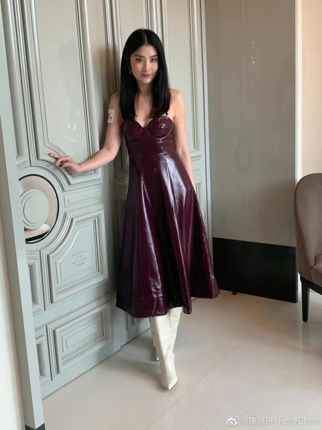 身着酒红色抹胸皮衣的陈慧琳十分具有御姐范儿,搭配白色长靴使整体的风格更加现代时髦。