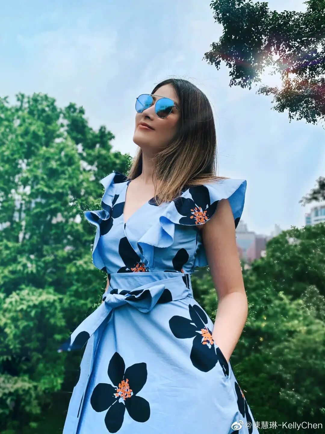 私下穿着蓝色花朵连衣裙的她也有着甜美清新的一面,整体更有法国女人钟爱的小清新元素,也给我们耳目一新的青春活力感。