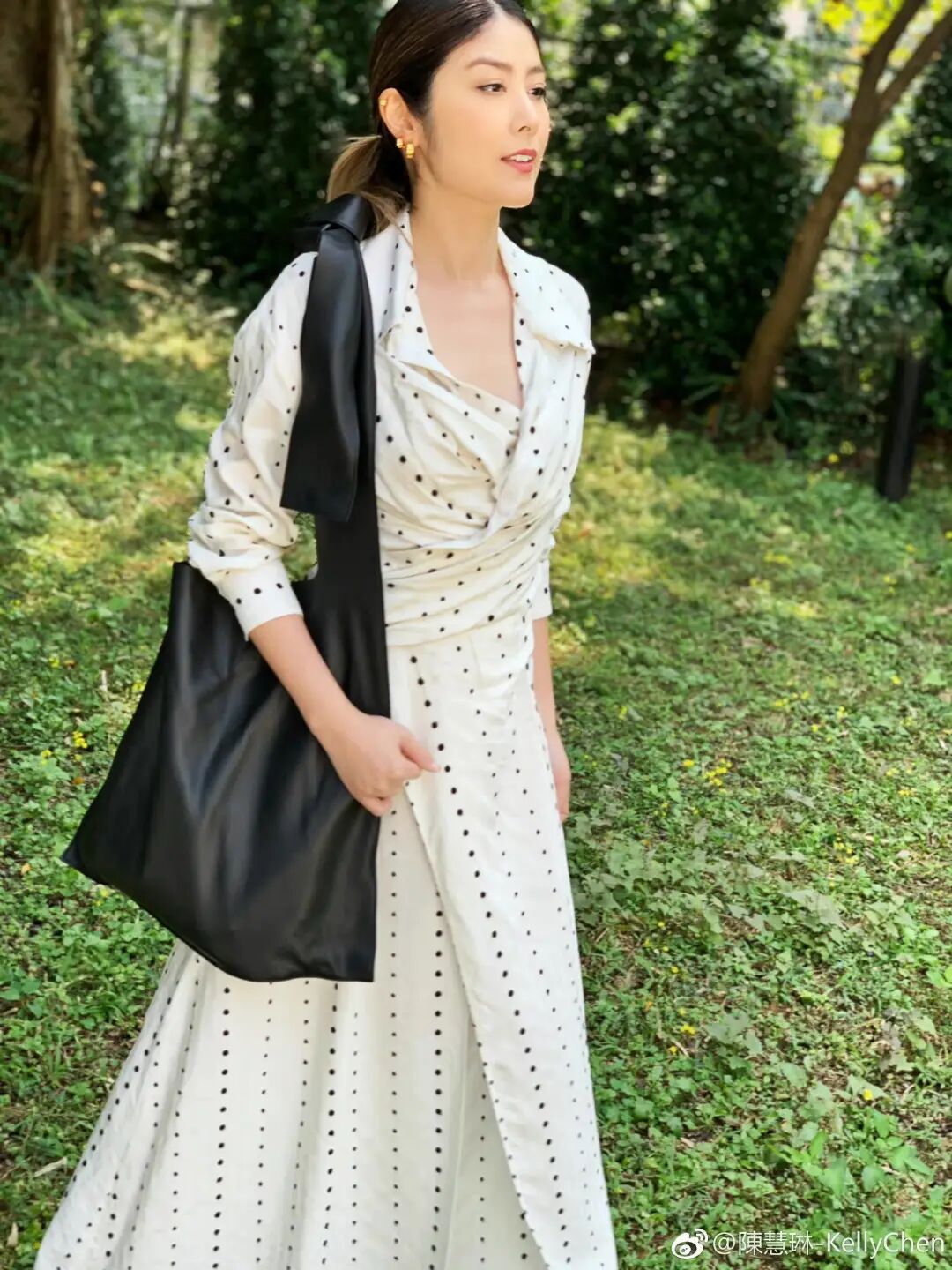 白色波点连衣裙搭配黑色大号包包,很有极简大牌味道。