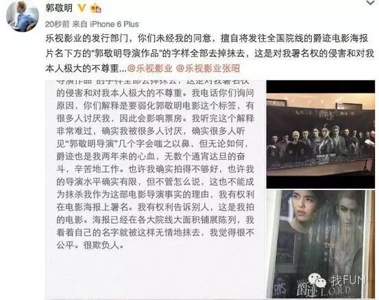 乐视影业的发行部门,你们未经我的同意,擅自将发往全国院线的爵迹电影海报片名下方的“郭敬明导演作品”的字样全部去掉抹去,这是对我署名权的侵害和对我本人极大的不尊重。我电话你们询问原因,你们解释是要弱化郭敬明电影这个标签,有很多人讨厌我,因此会影响票房,我听完这个解释非常难过,确实我被很多人讨厌,确实很多人听到“郭敬明导演”这几个字会嗤之以鼻,但无论如何,爵迹也是我两年来的心血,无数个通宵达旦的奋斗,辛苦的工作,也许我确实拍的不够好,也许我的导演水平有限,但不管怎么说,这也不能成为抹杀我作为这部电影导演事实的理由,我有权利在电影海报上署名,我有权利告诉别人,这是我拍的电影,海报已经在各大院线大面积铺陈展列,我看着自己的名字就被这样无情的抹去,我觉得很不公平,很欺负人。