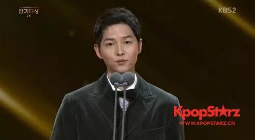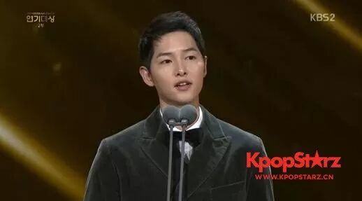 在开始颁奖之前,宋仲基表示:“时隔1年再次站在这个舞台感觉很紧张”,“1年前,我幸运地获得了大奖。至今我仍忘不了第一次接《太阳的后裔》的剧本,翻到最后一页时的颤抖。2017年对我而言,是一个永生难忘的一年,感谢KBS。”
