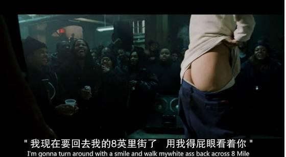 电影里的battle比《有嘻哈》里的要粗暴多了,什么f**k、d**k都直接上,甚至直接脱裤子嘲讽对手: