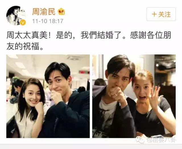 娱乐圈终极虐狗惨案爆发了,今天傍晚(也就是光棍节前夕)周渝民宣布和交往多年的女友喻虹渊结婚了。