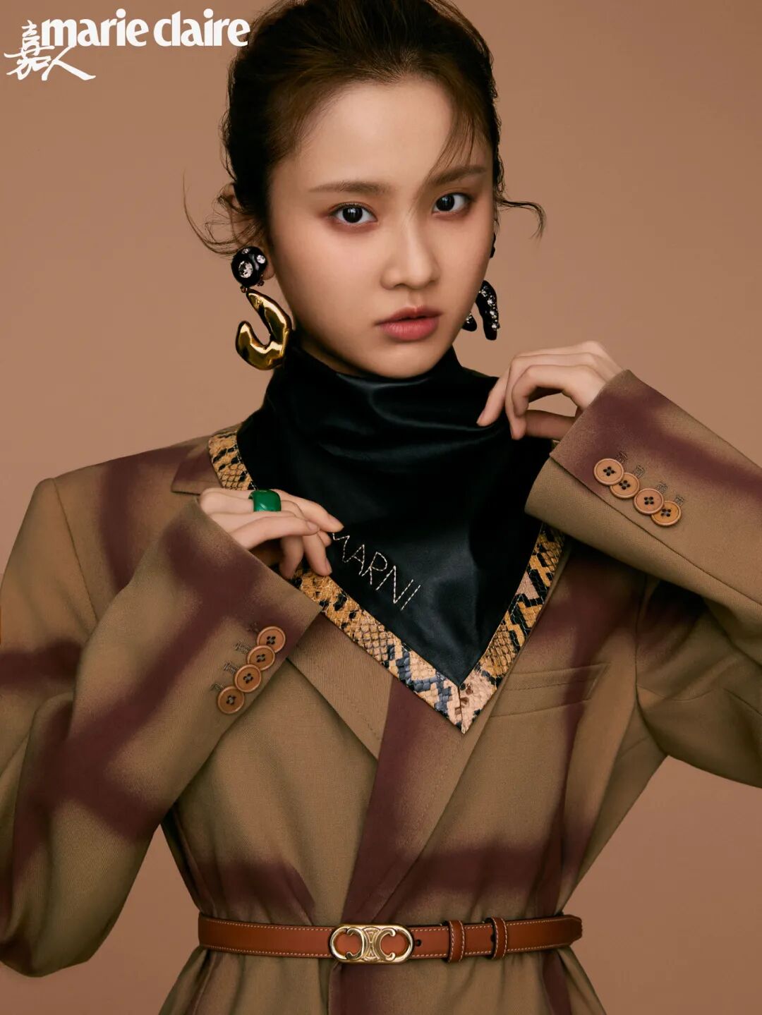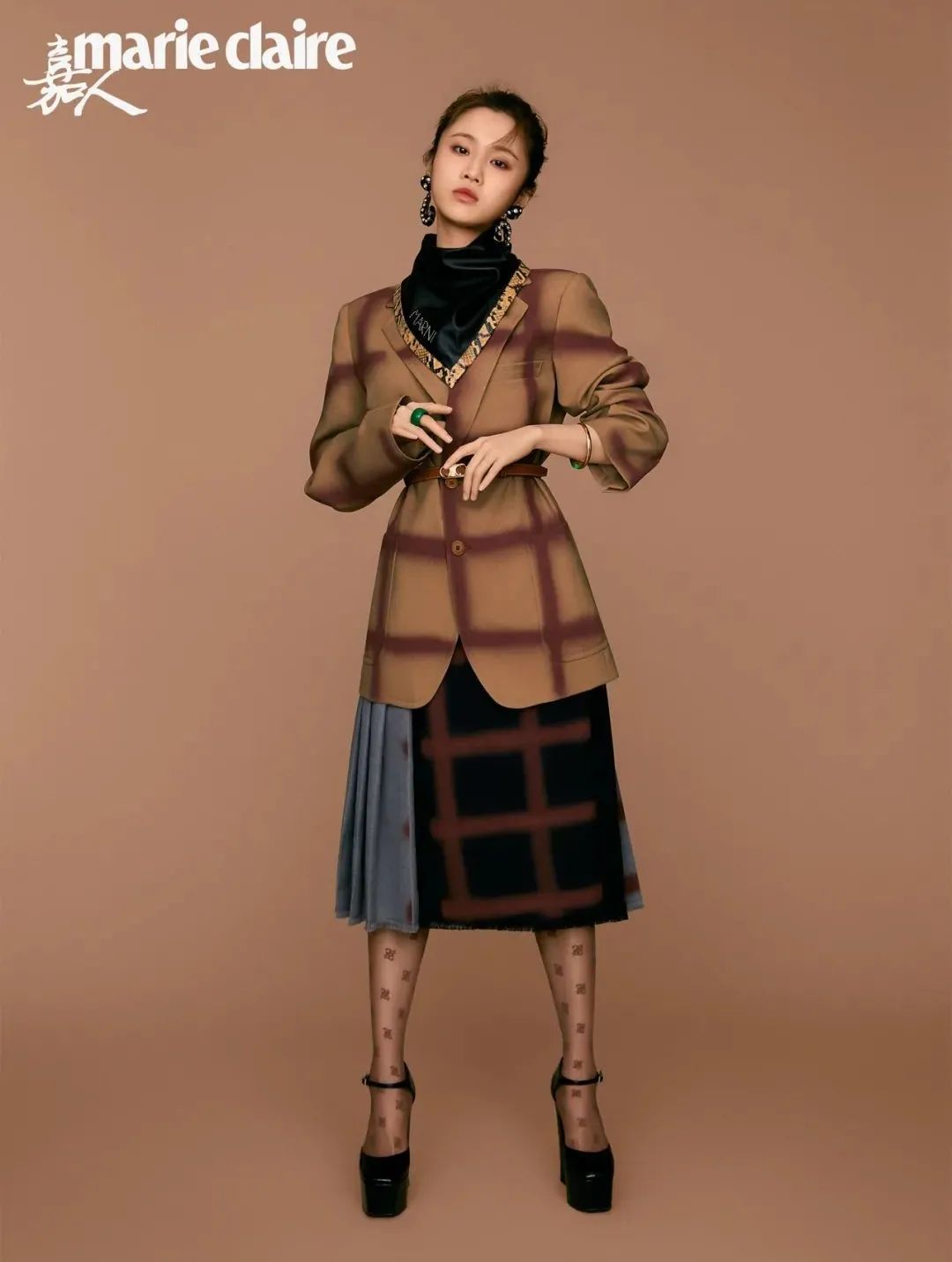 格纹西装外套、拼接半裙、黑色三角领巾、几何耳环 均为 MARNI