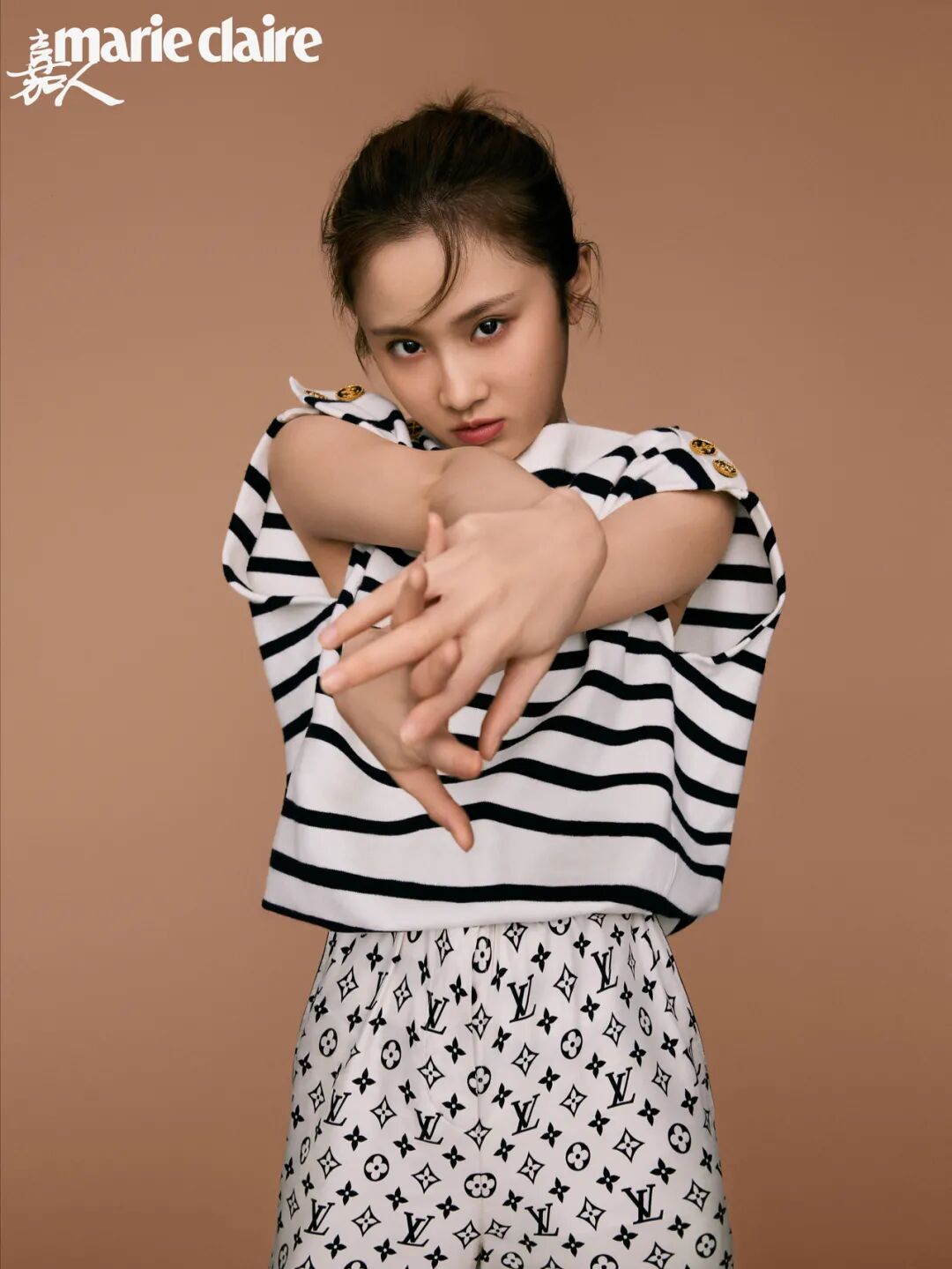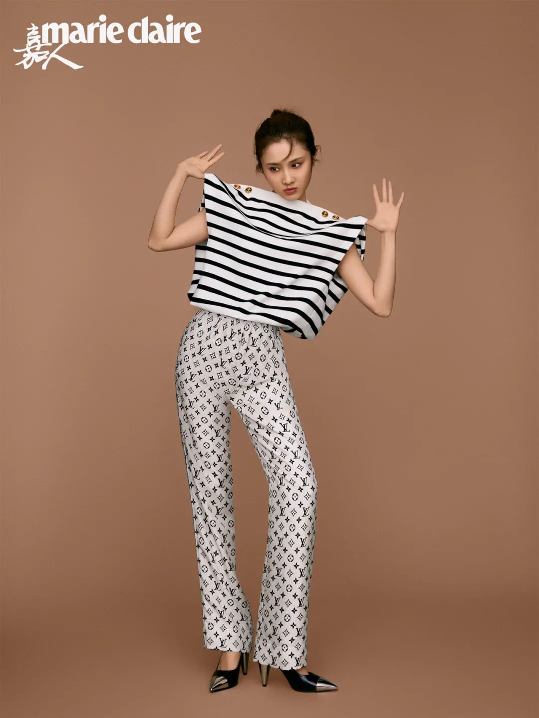 条纹无袖上衣、Monogram印花长裤、银色金属饰高跟鞋 均为 LOUIS VUITTON