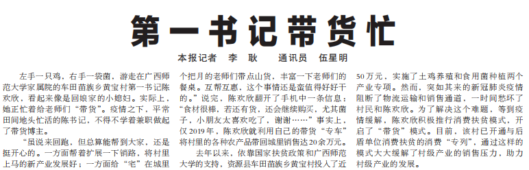 3月30日,《广西日报》第五版报道了我校在车田苗族乡黄宝村担任第一书记的陈欢欣的扶贫故事。