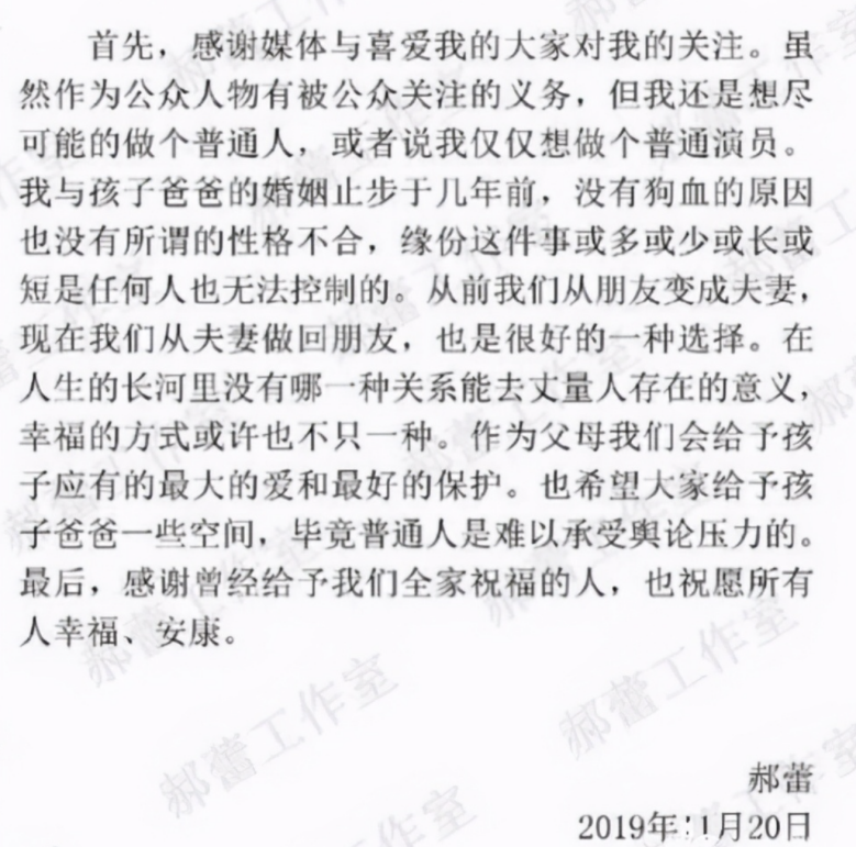 没多久郝蕾就在微博上宣布了自己和刘烨离婚的事情,她说道:“虽然作为公众人物有被公众关注的义务,但我还是想做一个普通人,或者说是一个普通的演员”