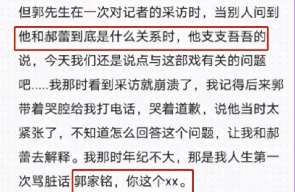 后来有一些记者采访郭家铭的时候问道是否正在和郝蕾相恋,他没否认也没承认,这无疑更加证实了外界的猜测,可怜的郝蕾真心对待郭家铭,结果对方只是把你当垫脚石。