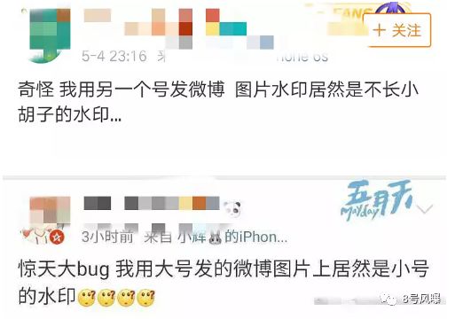 结合网友的吐槽,用大号发微博,水印竟然显示的是小号↓