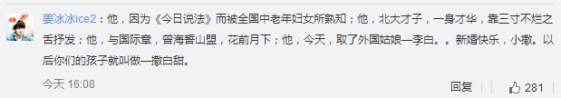 唯一不和谐的可能就是有网友在说,撒贝宁领证结婚,新娘却不是章子怡。但节操姐却觉得还是谢谢章子怡的不嫁之恩,小撒和汪峰才各自收获了幸福。