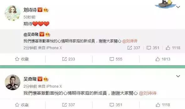 直到12月20日下午4点多,吴奇隆发微博官宣怀孕喜讯:“我们怀着激动喜悦的心情期待家庭的新成员,谢谢大家关心。”妻子刘诗诗转发:“期待!”