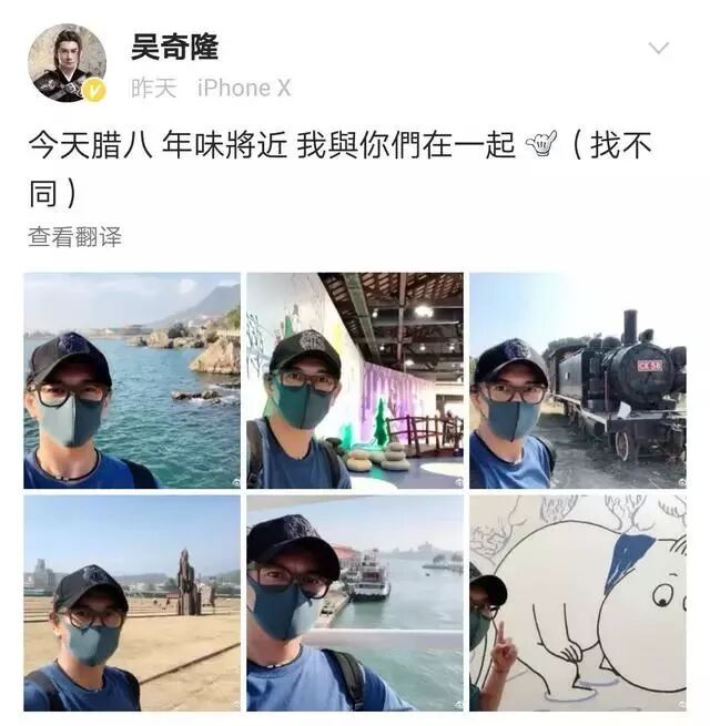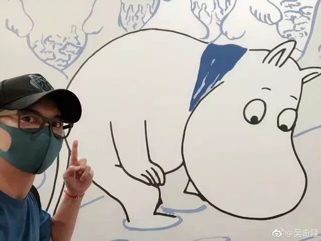 在晒出的自拍照中,吴奇隆戴着口罩与黑框眼镜亮相,分别与各种建筑、景点合影,瞪着大眼睛,看起来瘦了很多。不过在最后一张照片中,吴奇隆也是童心未泯,伸出一只手指头,指着墙上的动漫人物,十分的可爱。