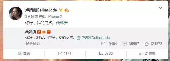 今天韩庚发博并置顶,卢靖姗转发,彼此互称对方为“我的男/女孩”,尹正也在评论里回复“庚哥好棒啊”~~经韩庚团队工作人员确认,确是公布恋情。