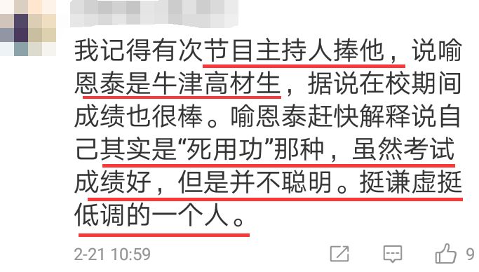 有网友说,有次主持人捧喻恩泰,说他是牛津高材生,喻恩泰赶紧解释自己是“死用功”,虽然考试成绩好,但并不聪明。