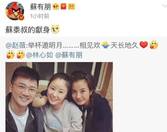 昨天元宵佳节大家都忙着和朋友聚会,这不,娱乐圈的三位好朋友也聚到了一起。没错就是林心如,赵薇和苏有朋。