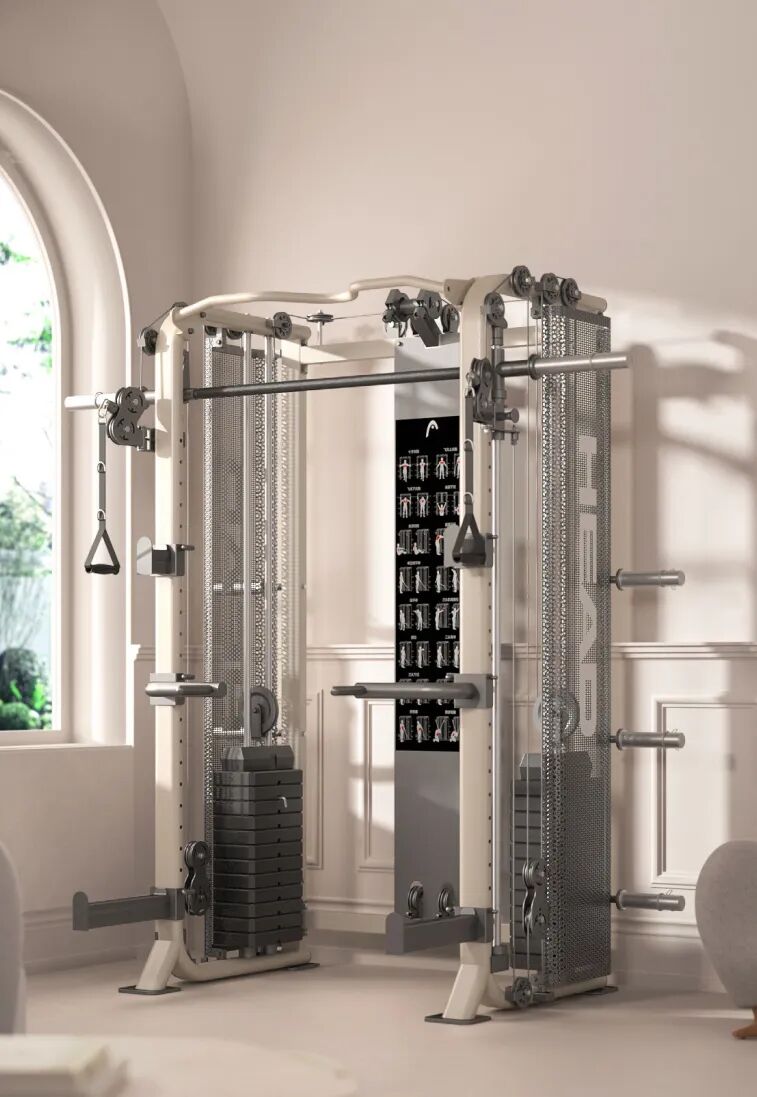 HEAD海德 多功能综合训练器SMI305 采用豪华配置,商用品质家用更舒适;丰富配件可解锁50+训练功能,一台就是一个健身房;机身可视化动作解析,一目了然,轻松上手;加粗加厚钢管,单侧80KG配重片,配置自由杠铃杆间歇台,锻炼更安心;外观设计则简约而不失力量感,线条流畅,配色时尚,是力量与优雅的结合。