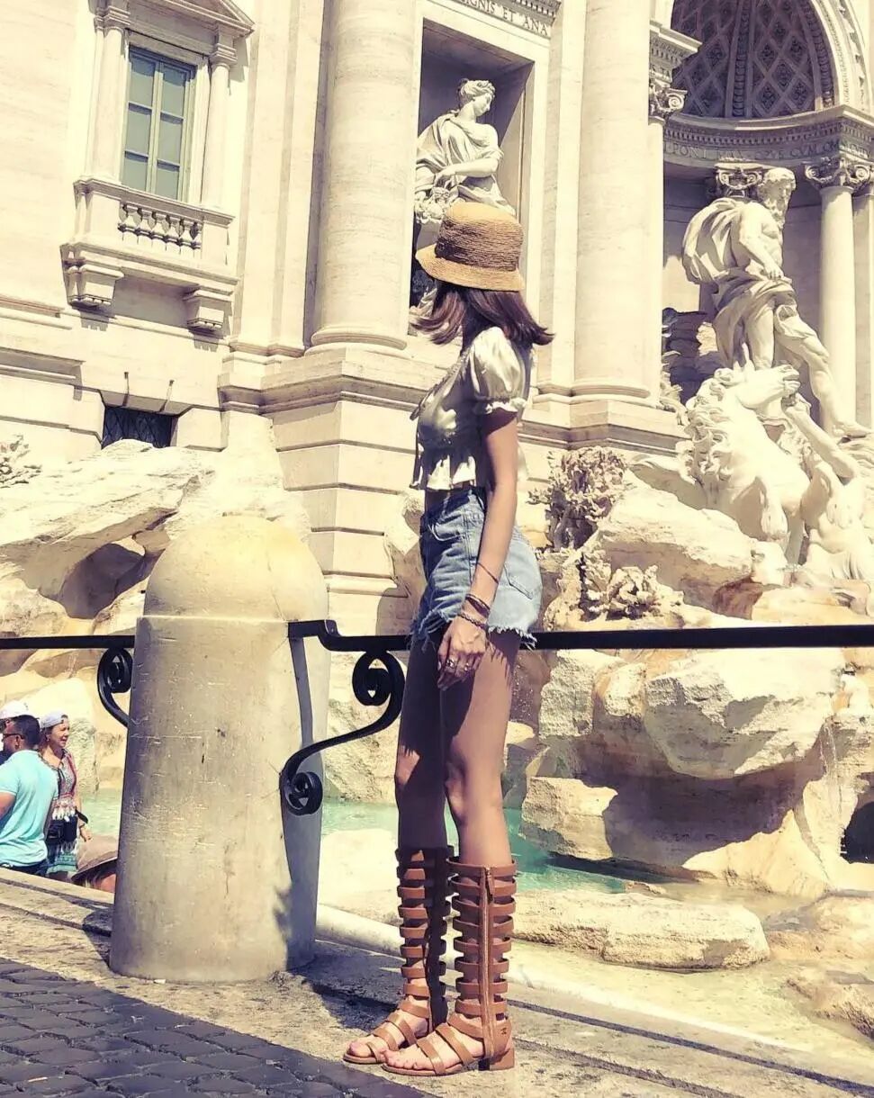 拥有超模身材的她自然也是可以轻松驾驭这双镂空的凉鞋,皮质的中筒凉鞋不仅可以展现她帅气的一面,在夏天穿也不会像中筒靴那样闷热,反而是清凉又时尚的结合。超短的热裤也能带给人强大的视觉冲击,法式风上衣利用泡泡袖元素达到了优雅的效果,配合一顶草编织帽更是充满了自然感。
