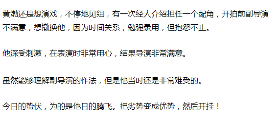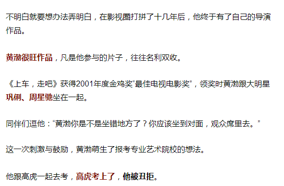 黄渤对这个机会如获至宝,拍起戏来特别认真,觉得自己演得不好,马上喊“卡”。