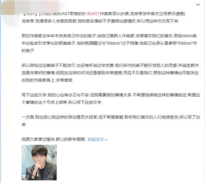 除此之前,前段时间刚出道的韩国男团B.HEART出道曲也被疑似抄袭了BEAST多首歌曲,甚至还因涉嫌抄袭直接登上NAVER话题榜2位!消息传出后,所属社却出面否认称:“没有抄袭”希望粉丝停止推测,而该事件出来后,龙俊亨出面发表声明,然而从他的声明可以看出小心翼翼,心疼。