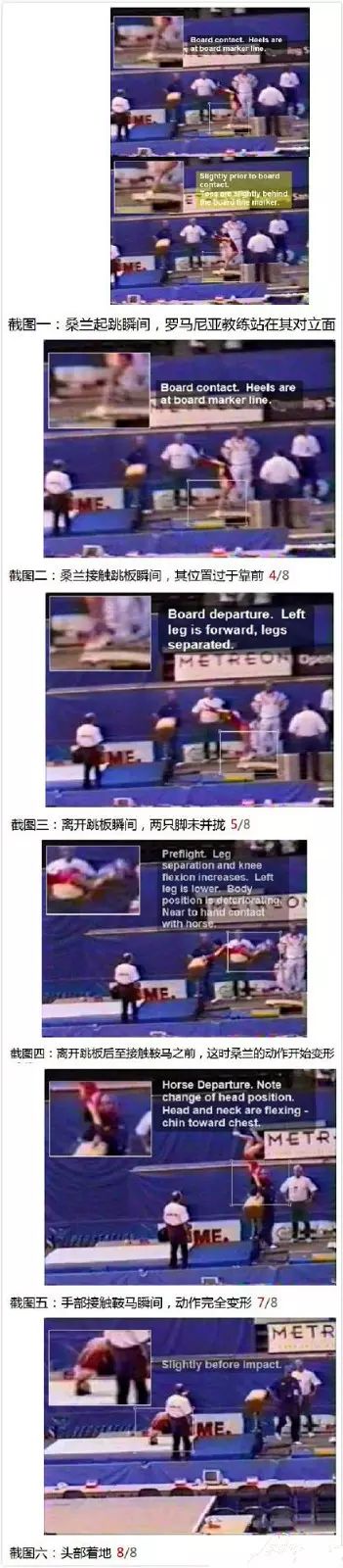 那么桑兰多跑了这20厘米,是不是因为受到罗马尼亚教练贝鲁的干扰所致呢?以追究桑兰受伤原因为唯一使命的桑兹教授,压根儿就没提撤垫子的事儿。也许他从来就不知道有一个撤垫子问题的存在。不过,桑兹教授给出的这9帧截图,无意中已经足够洗脱桑兰在第5版起诉书中对贝鲁的指控。