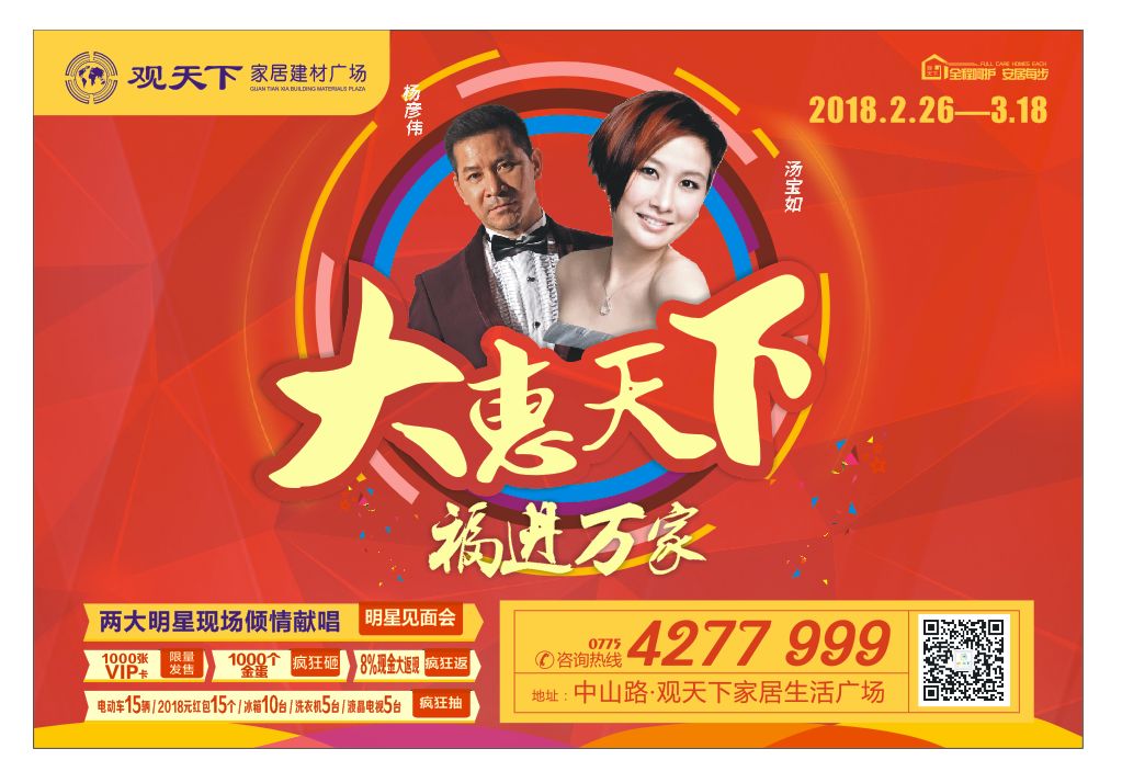 凭《贵宾卡》到观天下各品牌门店看产品,即可免费抽红包一个;凭《贵宾卡》集满10个品类印章送开光金狗一个;3月10号凭《贵宾卡》即可参加明星见面会。